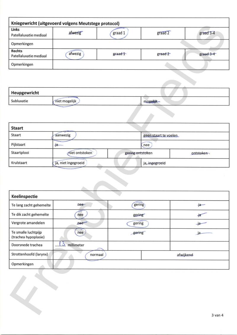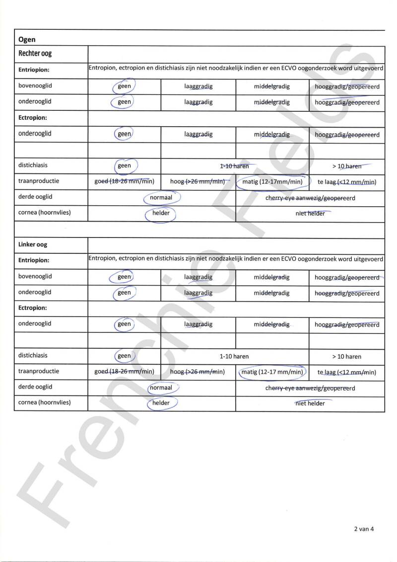 Ogen: In beide ogen wordt de traanproductie gemeten, het hoornvlies wordt nagekeken en er wordt gecontroleerd op een Cherry Eye. Wij hebben ook een uitgebreid oogonderzoek laten doen, het zg. ECVO oogonderzoek. Meer hierover vind je op de betreffende pagina.